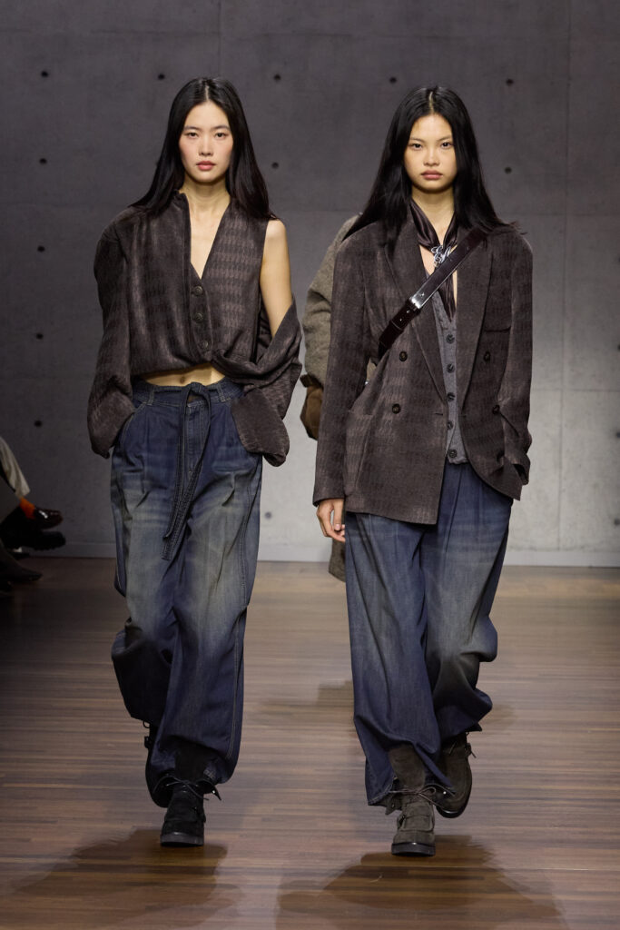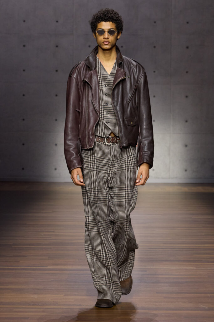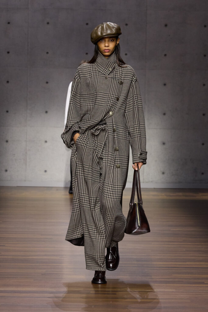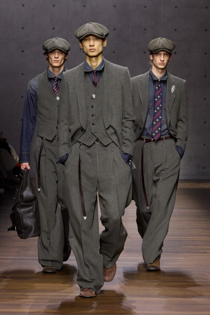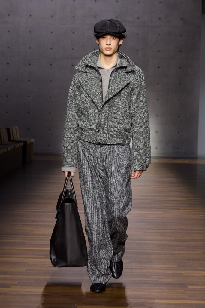 British formality with tailcoats, waistcoats, caps, provides the opening movement, though it is filtered through an Italian sensibility that loosens the posture without abandoning rigor. The silhouettes are vertical yet pliant; shoulders neat, never severe; proportions calibrated to suggest motion. The vocabulary is familiar: trench coats, enveloping overcoats, focus jackets, long cardigans, generous shirts slipping over cropped trousers in a tailoring rewrite that feels both studied and instinctive. Bermuda shorts cut with deep pleats interrupt the cadence, while denim appears like a recurring refrain, treated with the same respect as tweed or wool-linen blends.