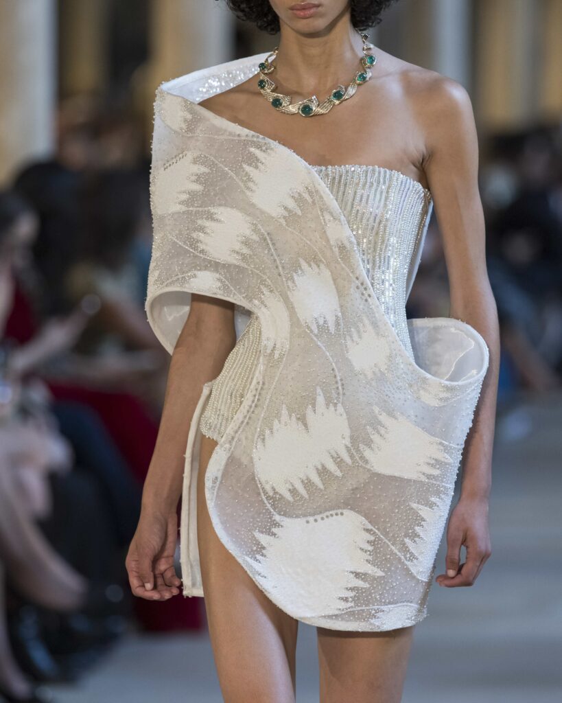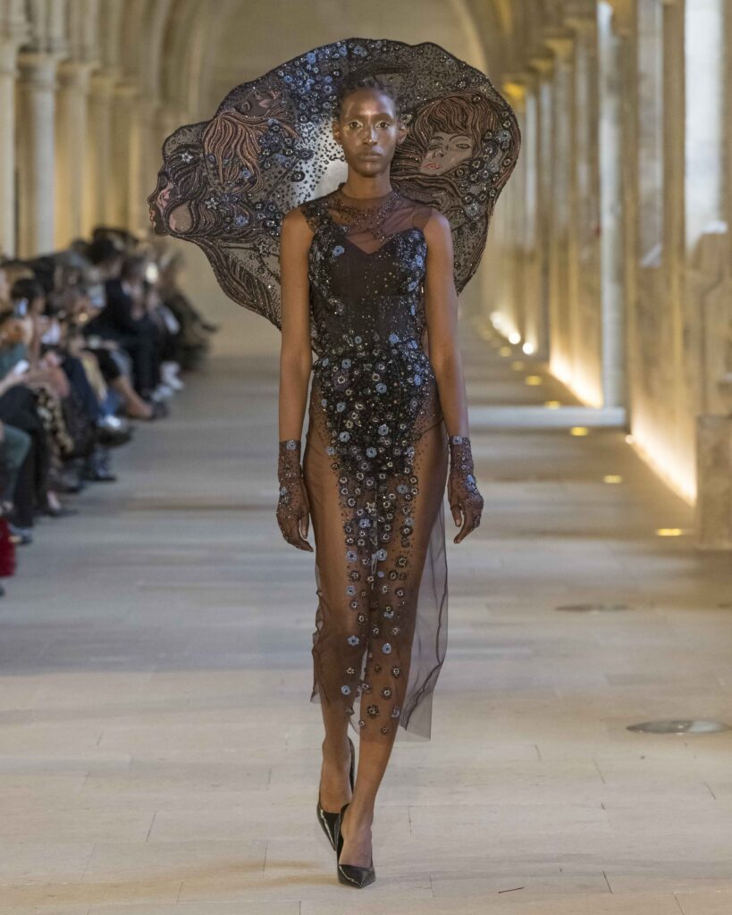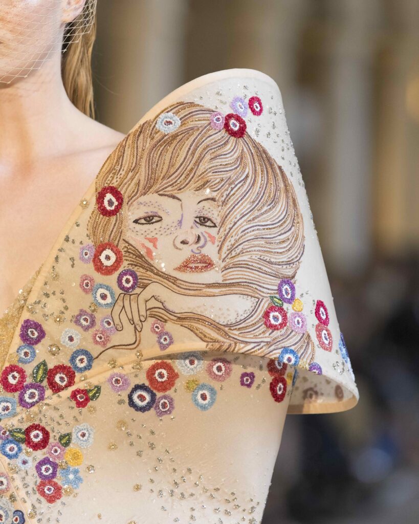 A remarkable facet of this collection is its dialogue with the aesthetic language of Gustav Klimt, whose gilded, intricate surfaces have long symbolized passion and transcendence. Mishra channels Klimt’s ornamental brilliance into the hands of India’s village artisans, bridging heritage and haute couture with remarkable finesse. Ancient techniques such as aari threadwork, zardozi, naqshi, dabka, and fareesha embroidery are revived and reinterpreted with contemporary sensibility. The results are lavish tapestries of silk organza, tulle, velvet, and satin, where resham threads entwine with freshwater pearls, kundan, beads, salli, and sequins—each element painstakingly crafted to form sculptural garments with a distinct sense of structure and flow.