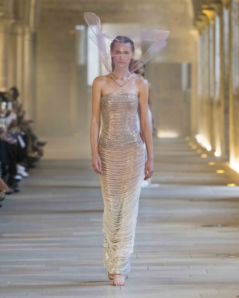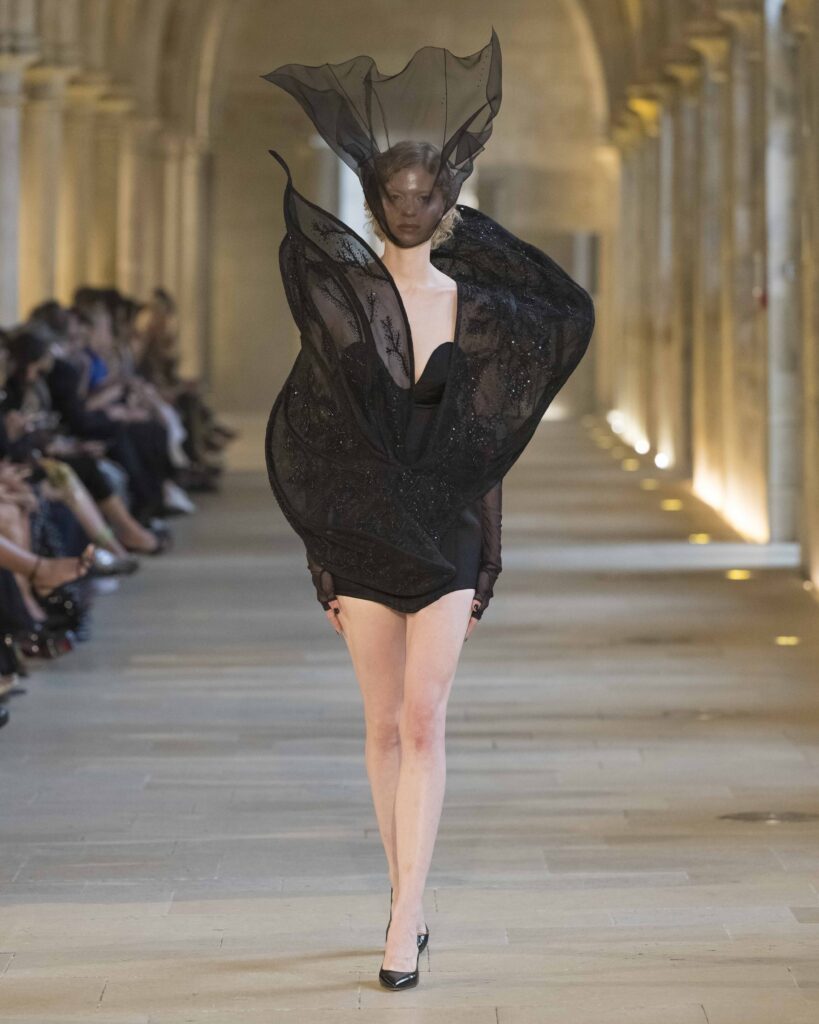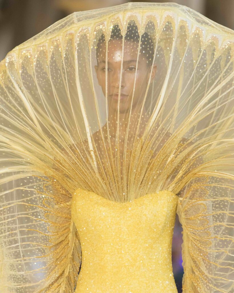 Elevating this vision further are the exquisite headpieces and veils by the legendary Stephen Jones. His collaboration with Mishra is more than an accessory partnership; it is a poetic exchange. Jones’s instinctive artistry and couture mastery create ethereal crowns that converse intimately with the garments, transforming the runway into a dreamlike tableau. These veils and headpieces do not merely adorn; they amplify the collection’s narrative of surrender and transformation, weaving an invisible thread of magic through every look.