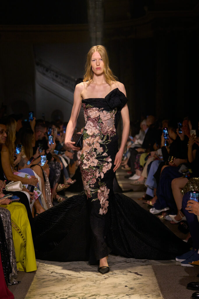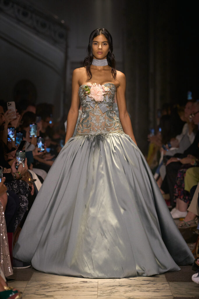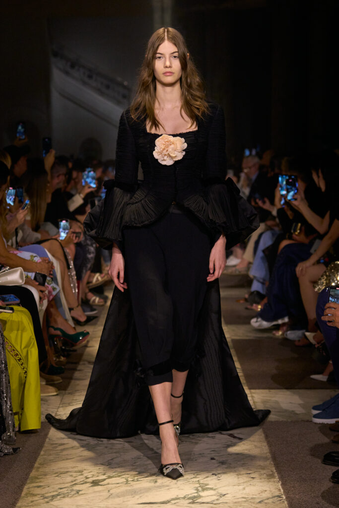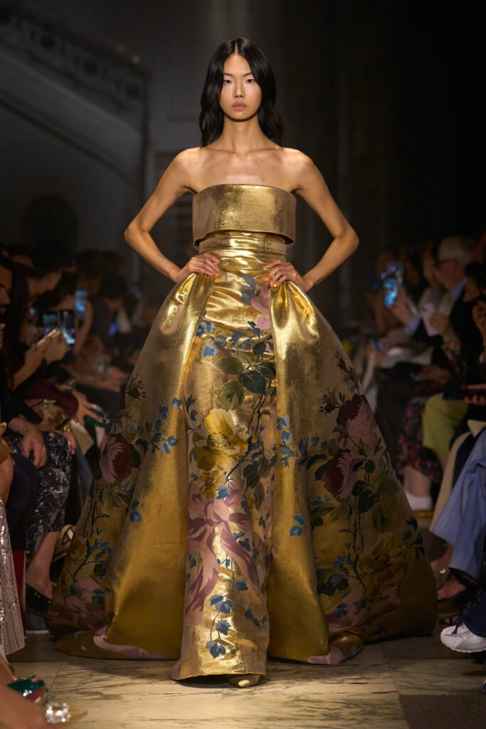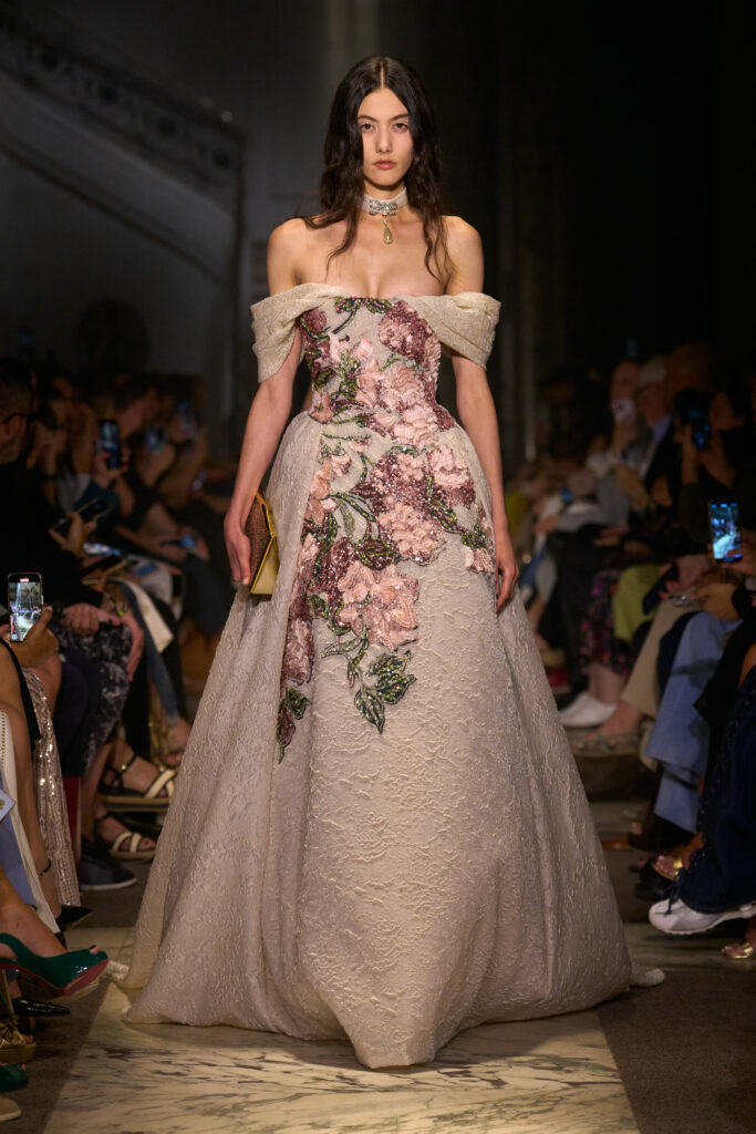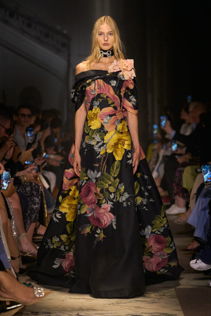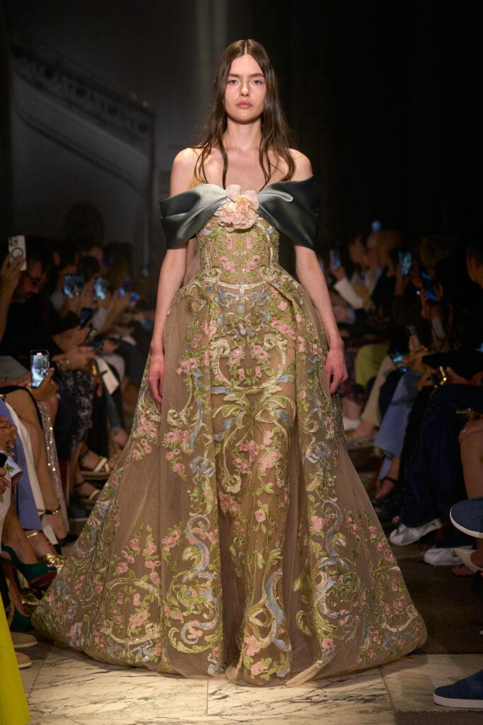 The palette was as poetic as it was purposeful. Macaron hues, rose thé, pistache, bleu de mer, were counterpointed by imperial black and sovereign gold. Through brocade, chiffon, and embroidered taffeta, florals erupted with painterly audacity, not as background but as protagonist. Each bloom was a testament to Saab’s deep commitment to craft: romantic, yes, but also rigorous, technique wielded like a scepter.