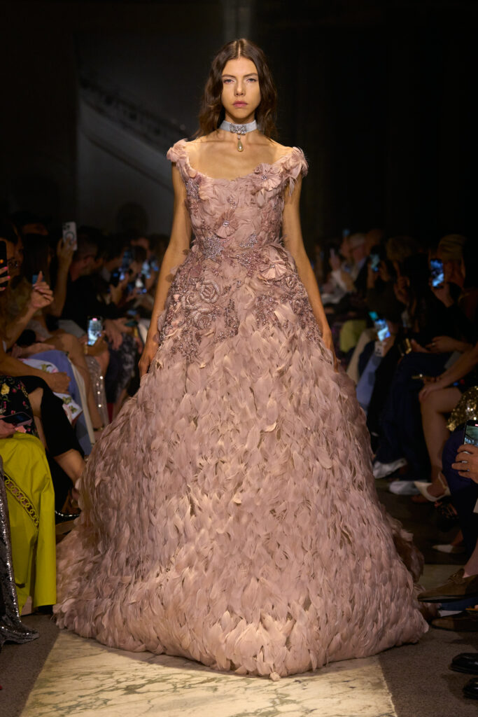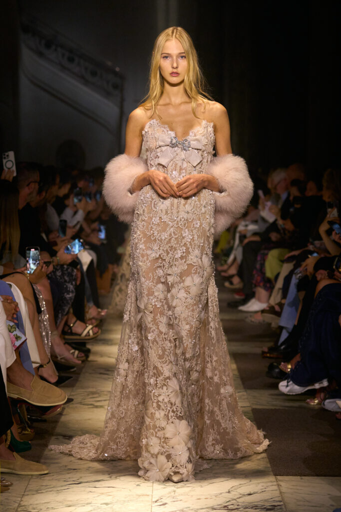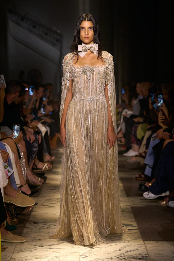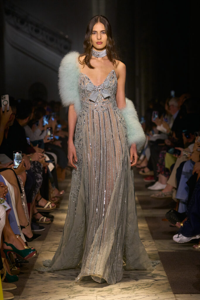 There were details that whispered while they dazzled: crystal-strewn bows fluttering across sheer backs, velvet capes pooling behind the shoulders like shadows drawn in silk, and delicately feathered gowns that seemed to hover rather than touch the floor. Saab’s fascination with adornment extended beyond the dress; couture accessories made their entrance with conviction, from minaudières in jewel-encrusted satin to clutches embroidered with regal precision.