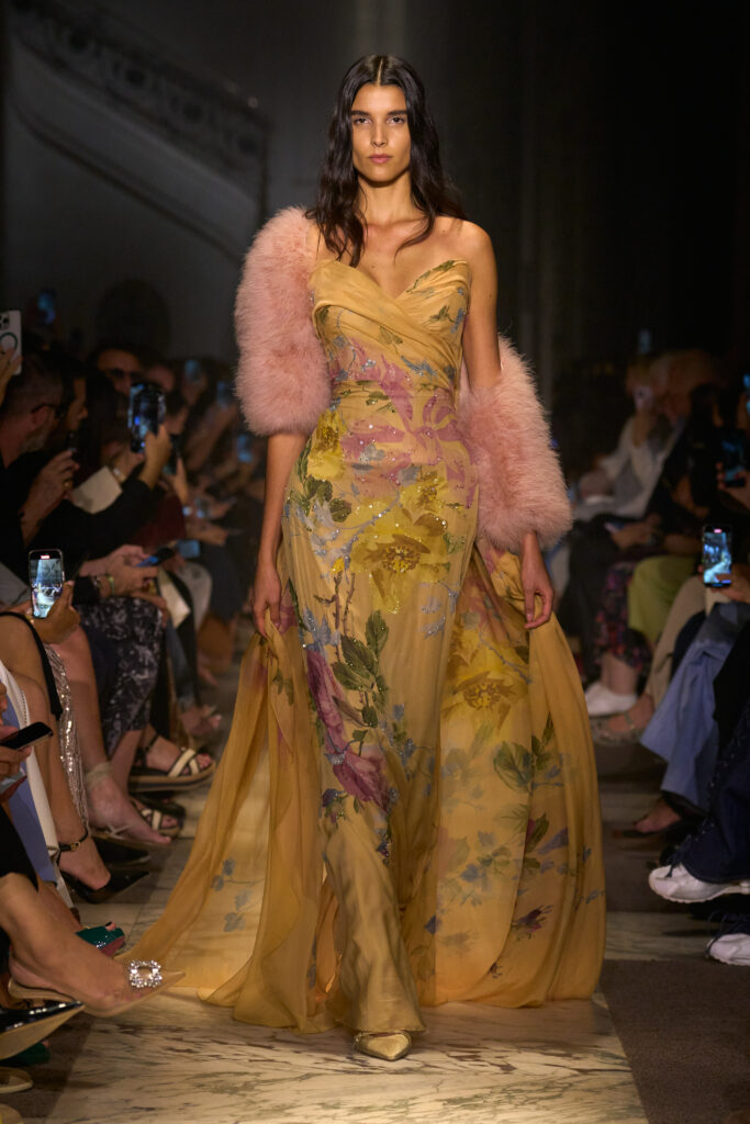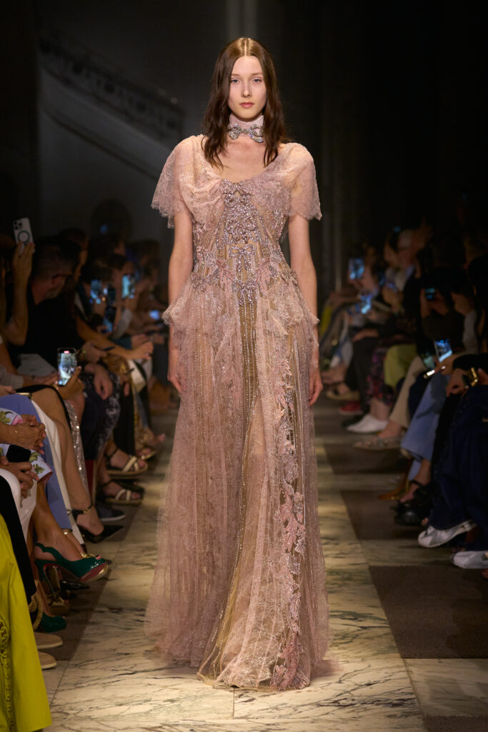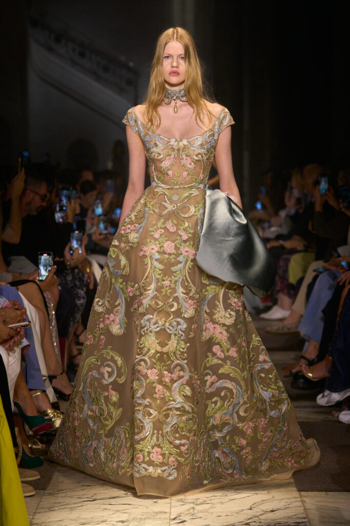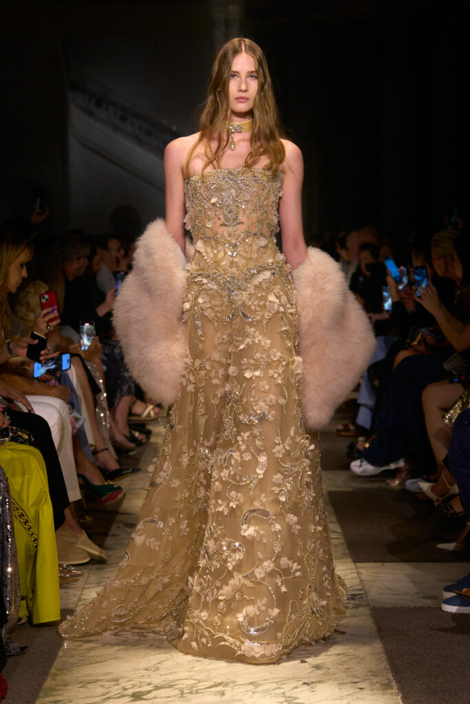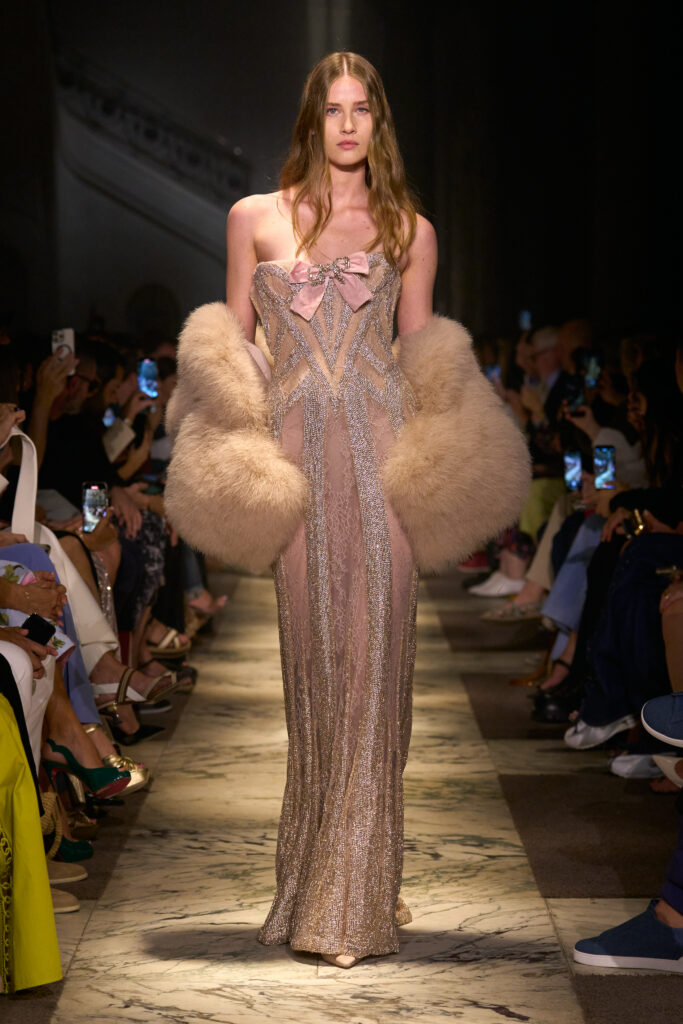 There were details that whispered while they dazzled: crystal-strewn bows fluttering across sheer backs, velvet capes pooling behind the shoulders like shadows drawn in silk, and delicately feathered gowns that seemed to hover rather than touch the floor. Saab’s fascination with adornment extended beyond the dress; couture accessories made their entrance with conviction, from minaudières in jewel-encrusted satin to clutches embroidered with regal precision.