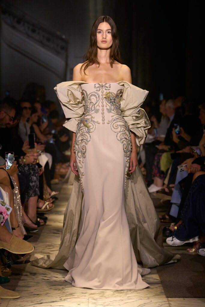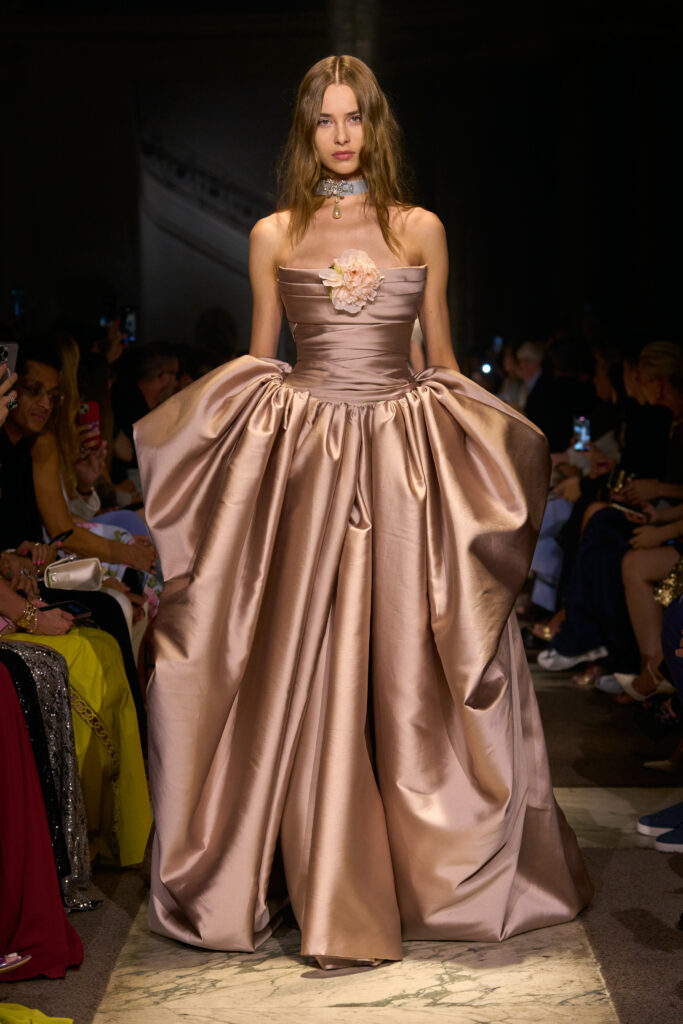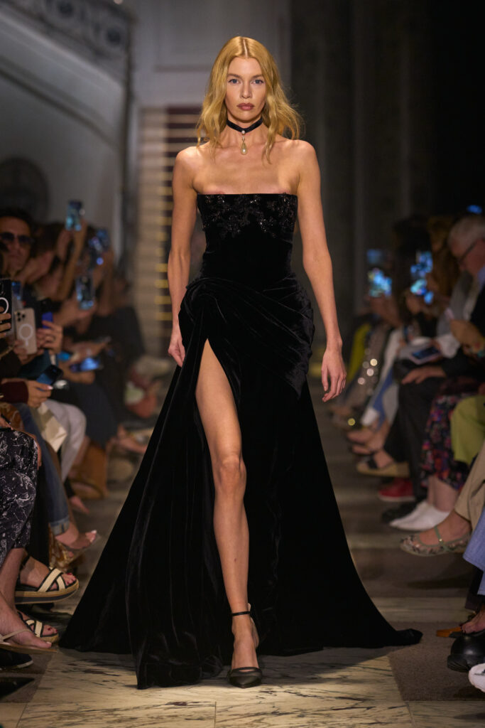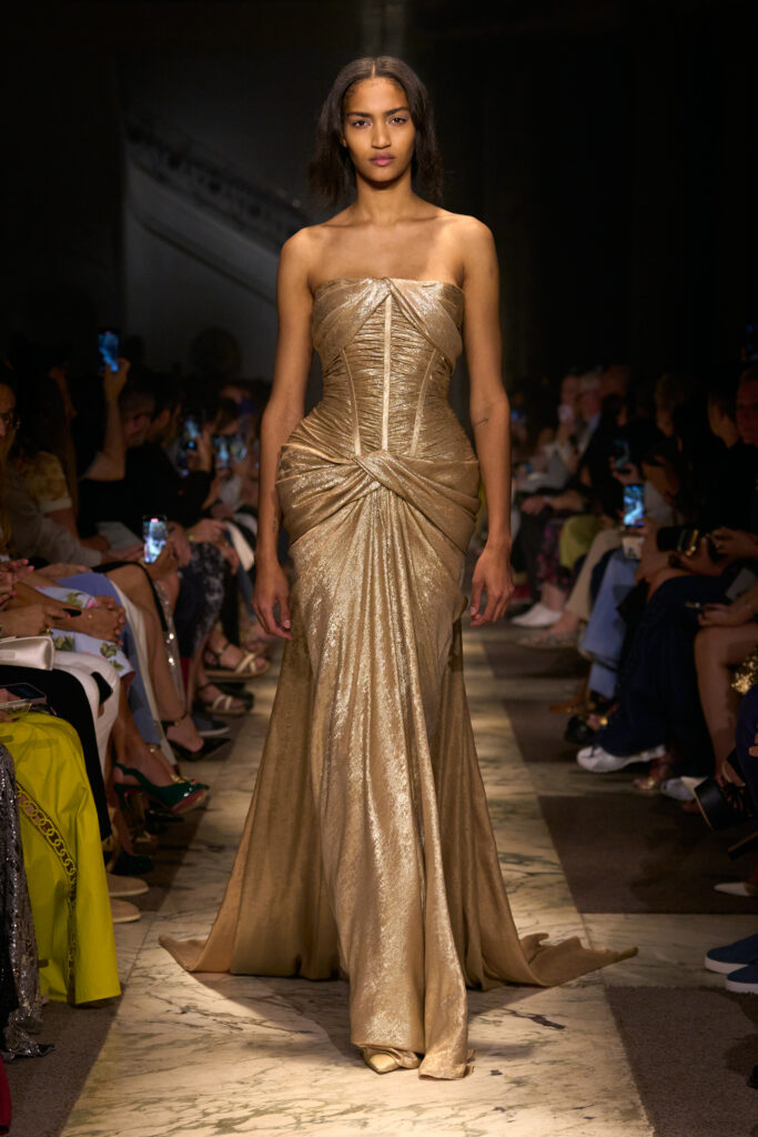 The silhouettes were masterfully sculpted: corsets emerged as bold declarations rather than whispered suggestions, reengineered through a distinctly French lens of seduction. In ebony velvet, molten metallics, or embroidered tulle, the corset became both shield and invitation, guarding the body while celebrating its curves with unapologetic flourish. There were flirtatious plays on volume: moiré sheaths cinched at the waist, draped to tease a sliver of skin, skirts that swelled into movement like silk sighing through air.