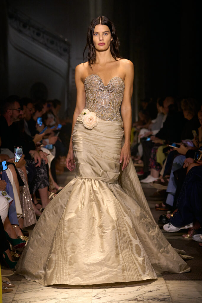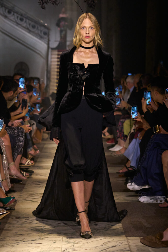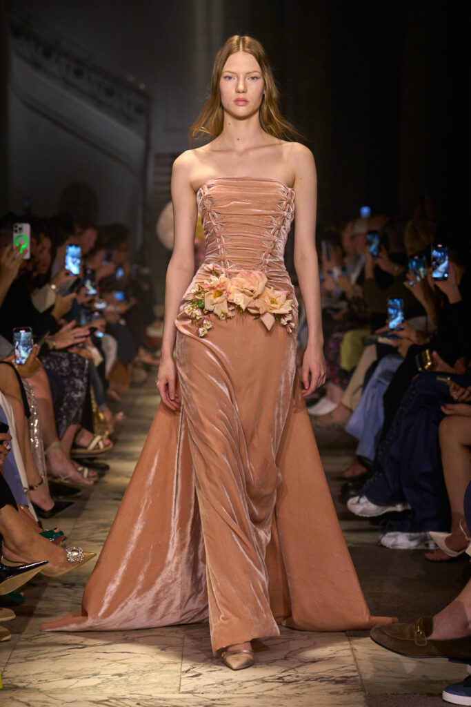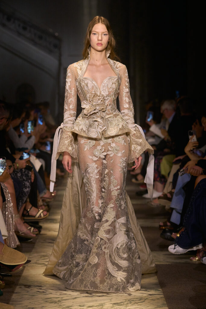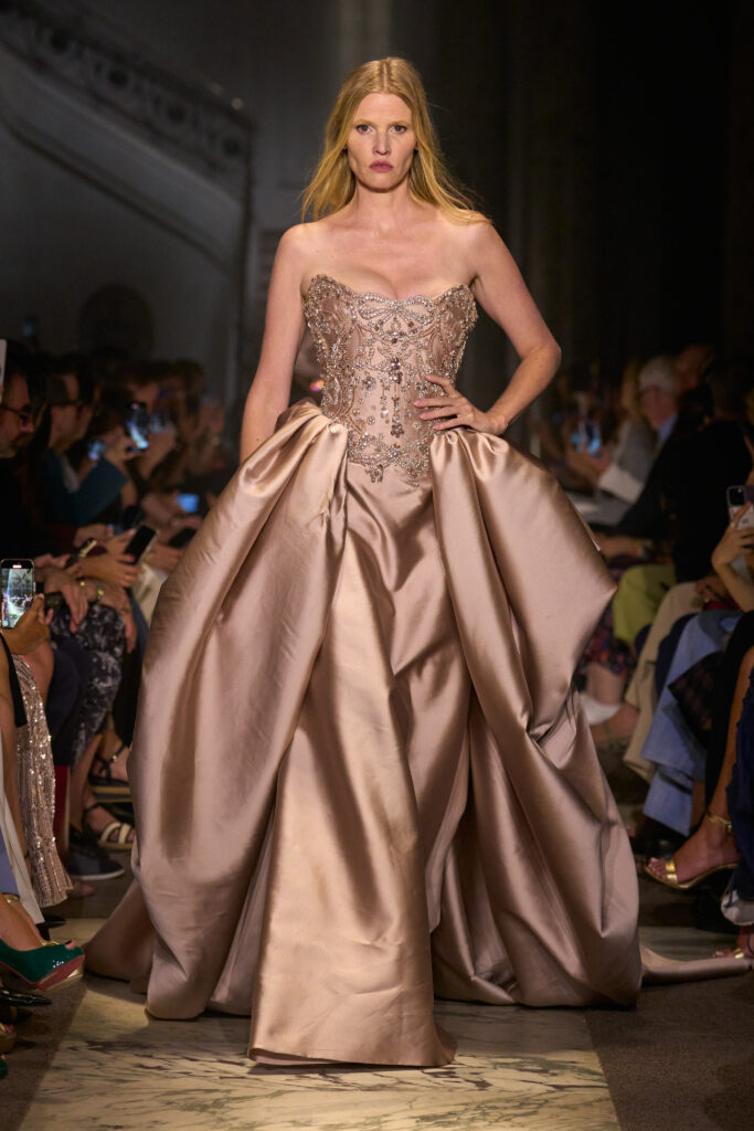 The silhouettes were masterfully sculpted: corsets emerged as bold declarations rather than whispered suggestions, reengineered through a distinctly French lens of seduction. In ebony velvet, molten metallics, or embroidered tulle, the corset became both shield and invitation, guarding the body while celebrating its curves with unapologetic flourish. There were flirtatious plays on volume: moiré sheaths cinched at the waist, draped to tease a sliver of skin, skirts that swelled into movement like silk sighing through air.
