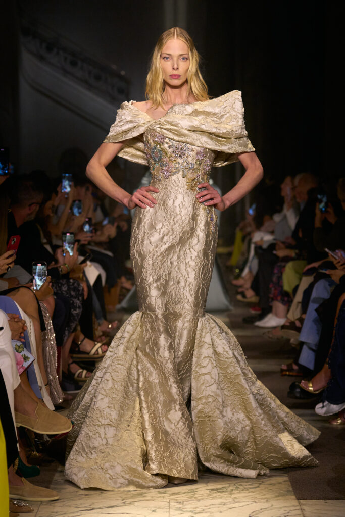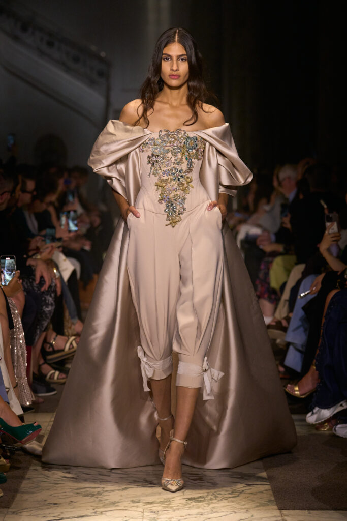 The opening scene was pure cinematic indulgence. Models swept into the space like heroines from a gilded novella. Draped in sumptuous silks and adorned with lustrous pearls, they weren’t nostalgic relics of aristocracy but avatars of a new kind of glamour: audacious, precise, irreverently elegant. Elie Saab knows his women; they are queens not because they obey, but because they rewrite the order.