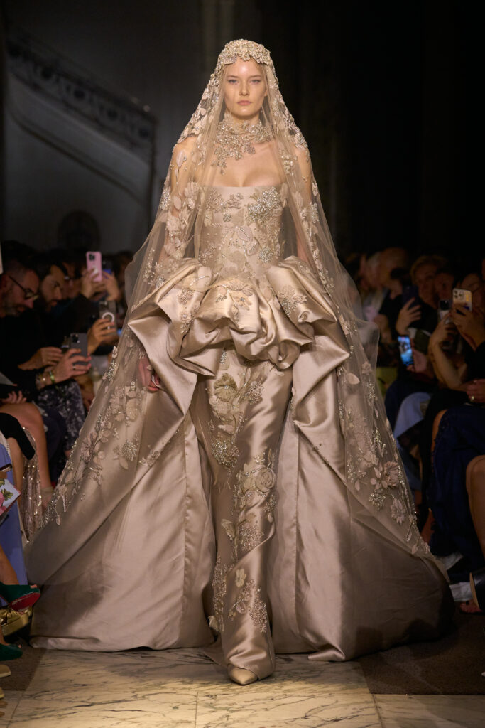 But the true crescendo of the evening arrived with the bride, a vision suspended between fantasy and divinity. Embroidered with moonlit florals and crowned in a voluminous pearl-toned overskirt, she didn’t simply walk the runway. She reigned, graced over it. As the room held its breath, Saab reminded us what couture is truly for: to celebrate the moments when fashion transcends time and enters the realm of memory.