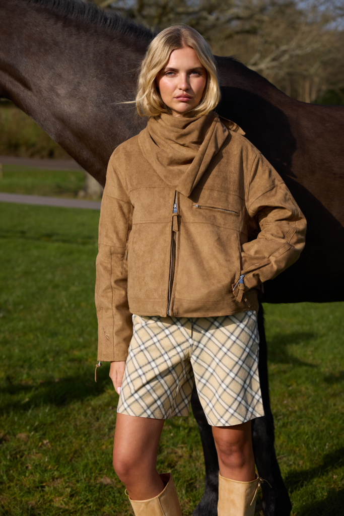 Alongside it, the faux suede Racer Jacket offers texture as narrative. Soft, tactile, and grounded in a wearable, neutral tone, it leans into versatility and a more modern way to wear clothes.
