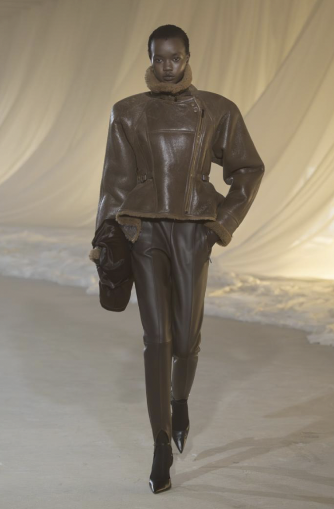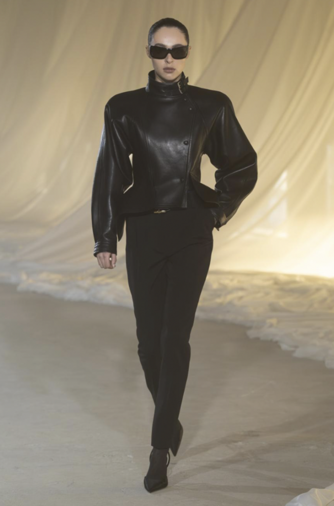 The opening look, a high-neck black leather peplum jacket, was a direct reference to a Pierre Balmain-designed Air France uniform. It was a statement of intent: respect for the heritage but with a sharp, aerodynamic edge.