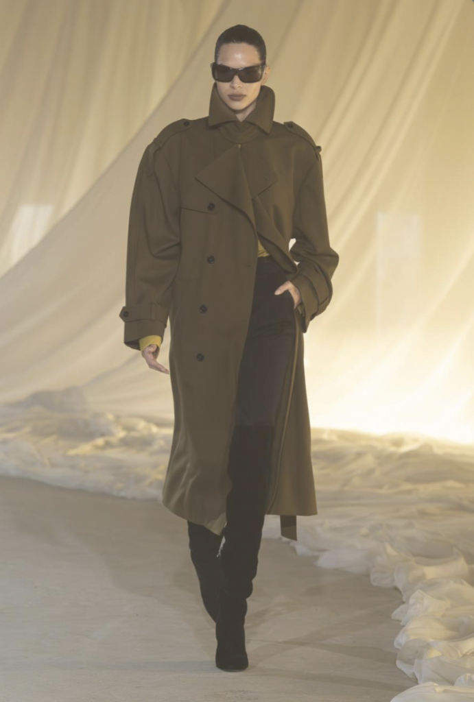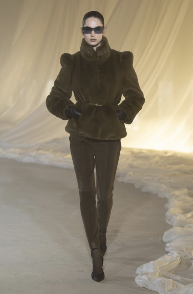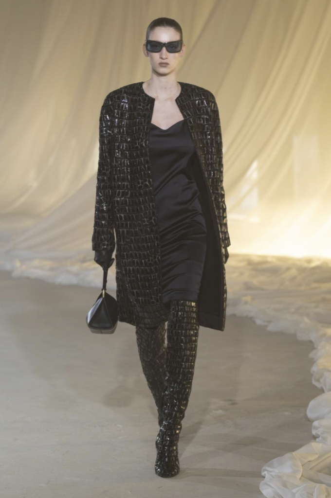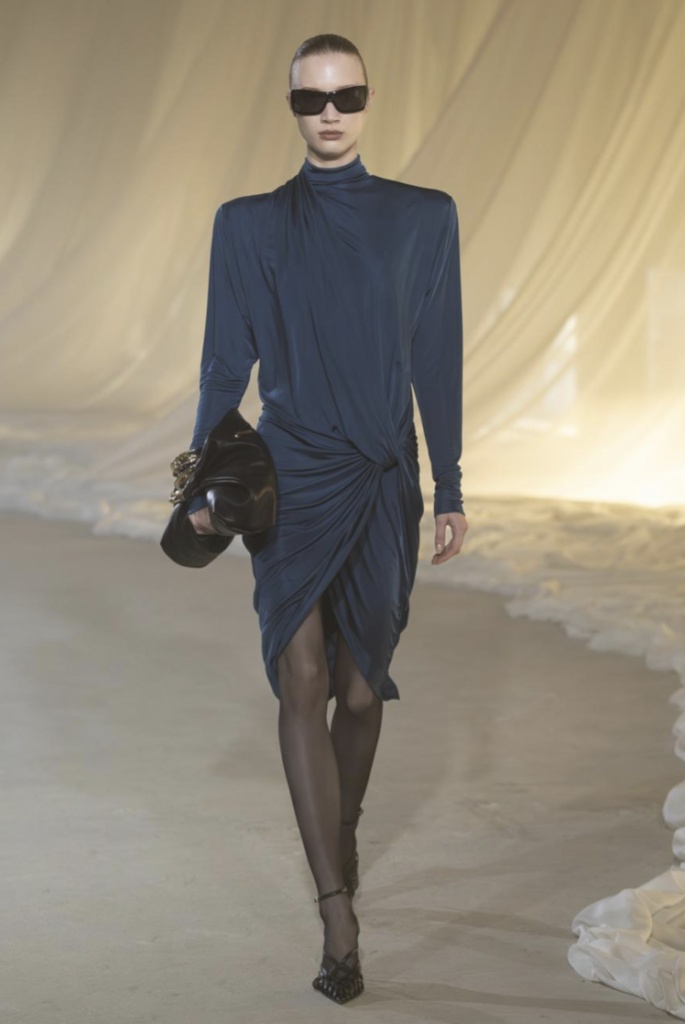 The Silhouette : Controlled opulence; sculptural draping meeting 80s-inspired shoulders.