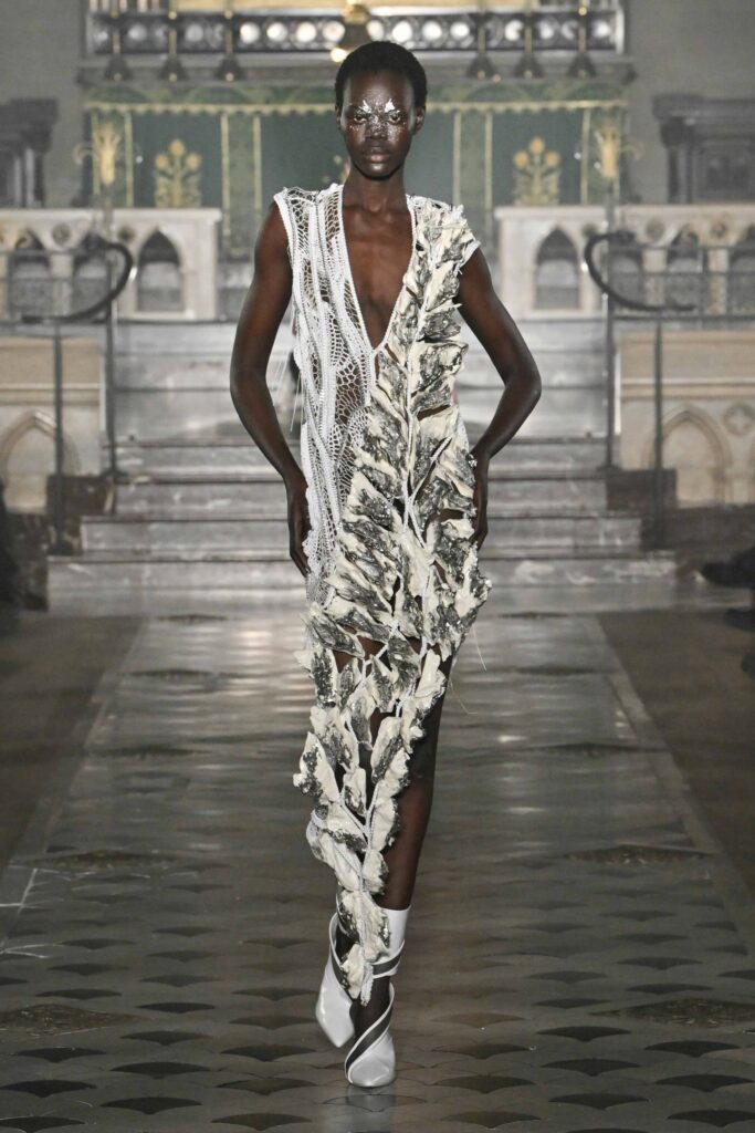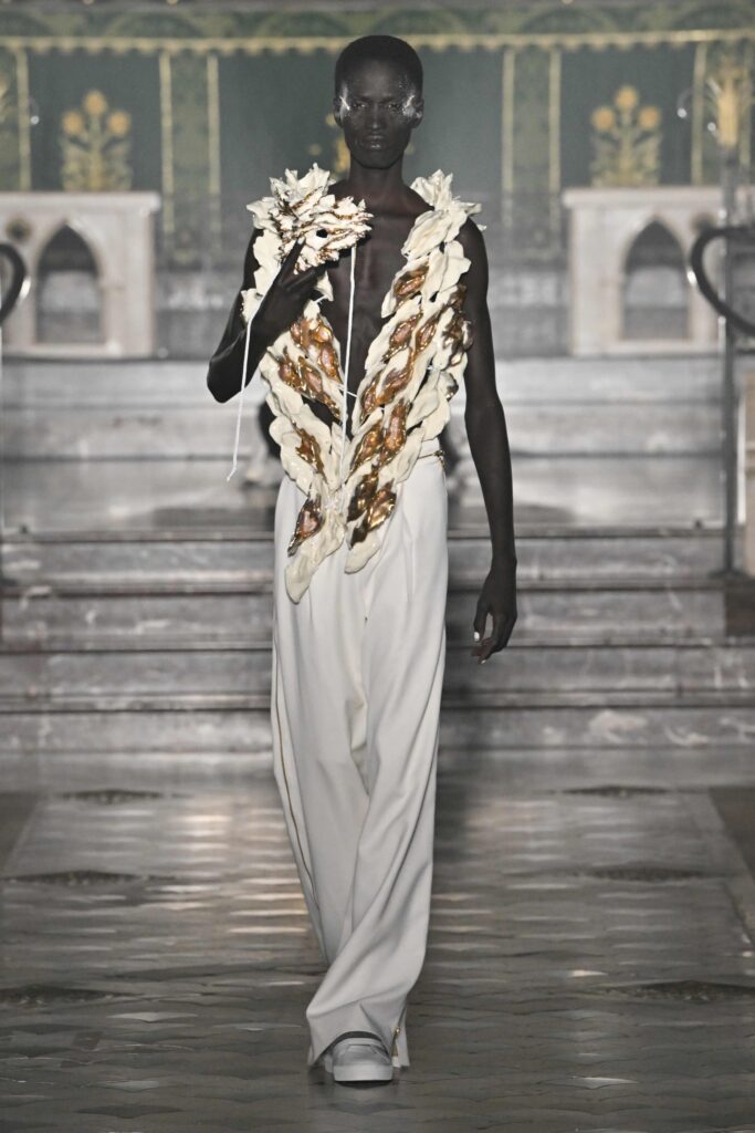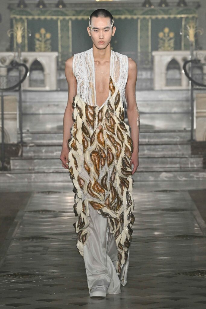 Nature, of course, has long been fashion’s most reliable muse. What distinguishes Nakazato’s approach is immersion. Over a six-month period, the designer spent more than 1,500 hours working directly with clay, producing thousands of ceramic elements by hand. The process was repetitive, almost meditative, allowing form to emerge through physical memory rather than design assertion. The result is clothing that appears shaped by erosion, as if grown rather than constructed.